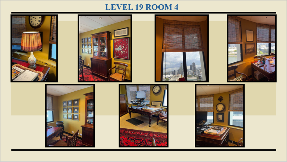 Tranquil, light-filled, room on North Quay, in the eastern corner of the building, and sheltered from western sun, the 6 x 2m x 2m windows give a spectacular outlook over the river, GOMA, and QAG from the penultimate floor of Inns of Court. Renovated floor to ceiling to a high standard by Withers + Miller for the current owner in 2021, the room has adjustable lighting, fitted sisal carpeting, and custom window blinds, and is offered with, or without, contents comprising quality antique furniture (including a matched pair of William IV library tables on original brass castors and a Georgian flame-mahogany Brief cupboard), paintings, and oriental carpets, sourced locally, and overseas.